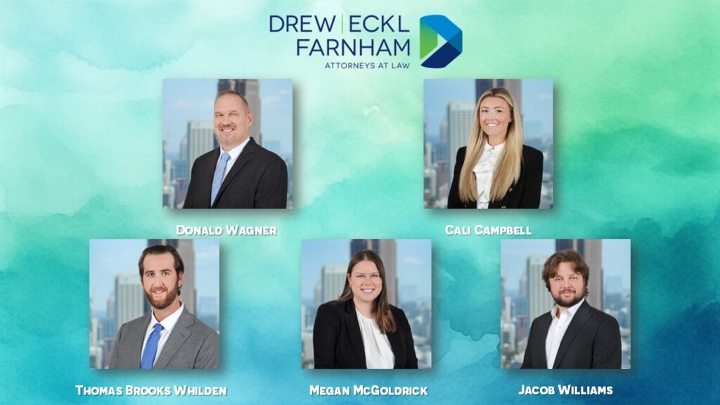 ATLANTA, GA – Drew Eckl & Farnham is proud to announce the addition of five new attorneys—Donald Wagner, Cali Campbell, Thomas Brooks Whilden, Megan McGoldrick, and Jacob Williams. These experienced attorneys bring valuable expertise and proven litigation skills to strengthen the firm’s ability to deliver comprehensive legal services across Georgia and the Southeast.