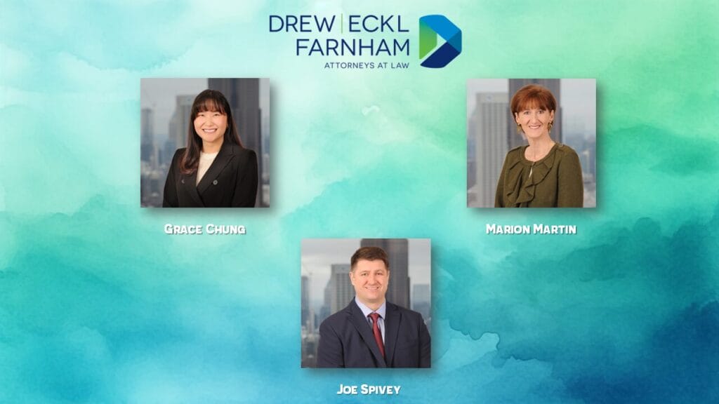 “We’re excited to welcome Grace Chung, Marion Martin, and Joe Spivey to Drew Eckl & Farnham,” said Joe Chancey, Managing Partner of Drew Eckl & Farnham. “Each of these attorneys brings a unique combination of experience, dedication, and client focus that aligns perfectly with our firm’s values. We’re confident they’ll make immediate contributions to our continued growth and success.”